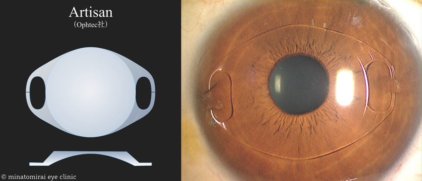 アルチザン(Artisan)はポリメチルメタクリレート(PMMA)製のハードコンタクトレンズのような硬さのレンズです。レンズの縦幅分の6mm弱ほどを切開して眼内に挿入するため、切開面を数針縫う必要があります。縫合した影響で一時的に乱視が増加することがありますが、その場合は手術の約2週間後に抜糸を行うとほぼ改善します。
